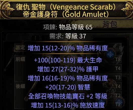 3、项链:+2召唤等级以上,血量、抗性、属性,精魂随缘。