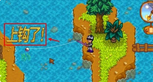 2、玩家拿出鱼竿后点击开始钓鱼,出现“上钩了”提示时再点击鼠标右键进行拉线;